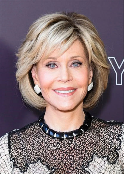 Jane Fonda Bob Type Human Hair Wavy With Bangs 12 Inches